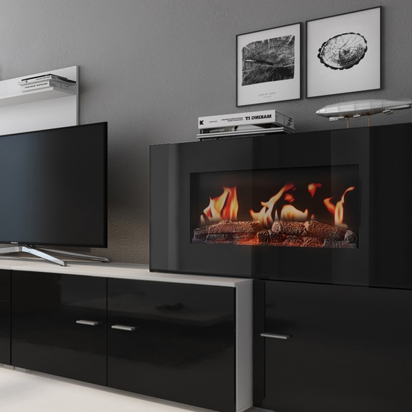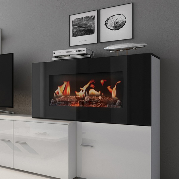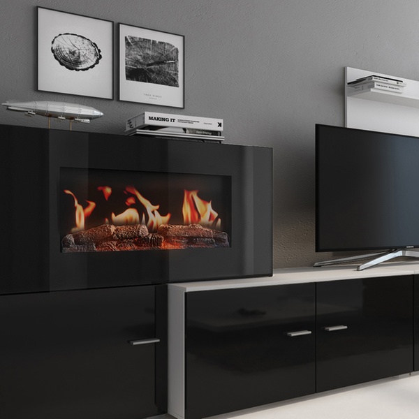 - Set comprises two modules: one upper panel with shelving and one lower module with electric fireplace