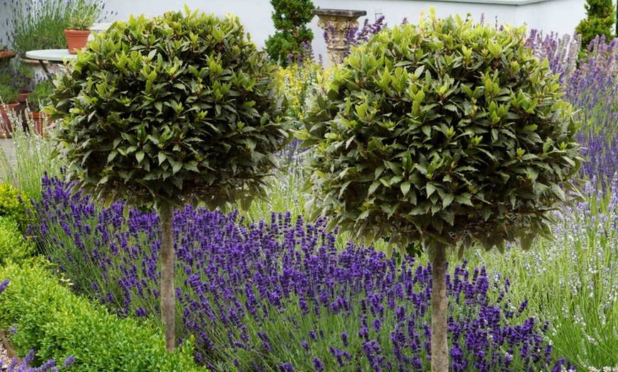 Radiating fragrant greenery, these standard bay trees bring culinary flair and elegance to any garden or entryway