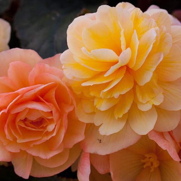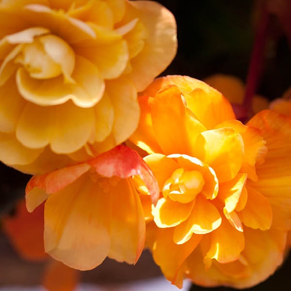 - Blousy double blooms in shades of yellow, gold, apricot, orange and ochre