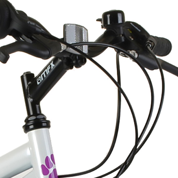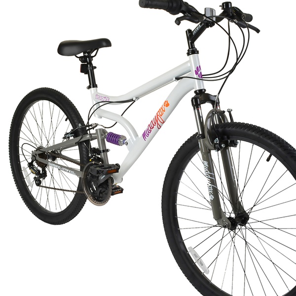 Featuring sleek white and grey finish. this Muddyfox mountain bike for women has dual suspension and 18-speed Shimano Revo gearing