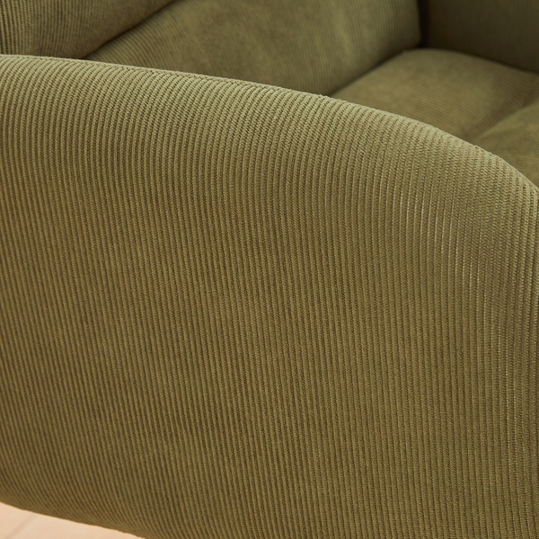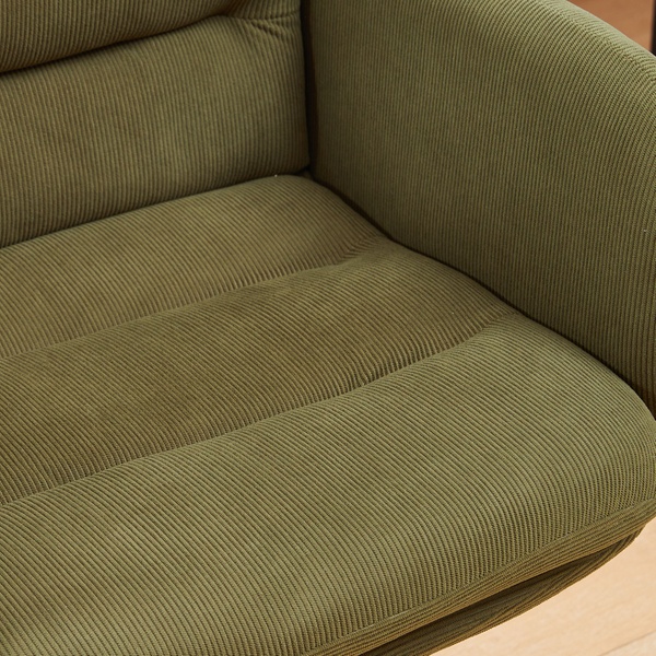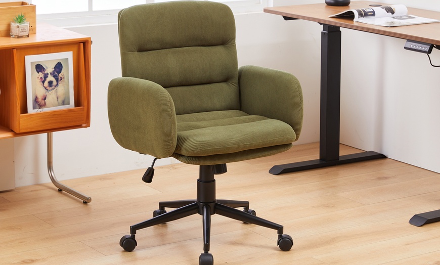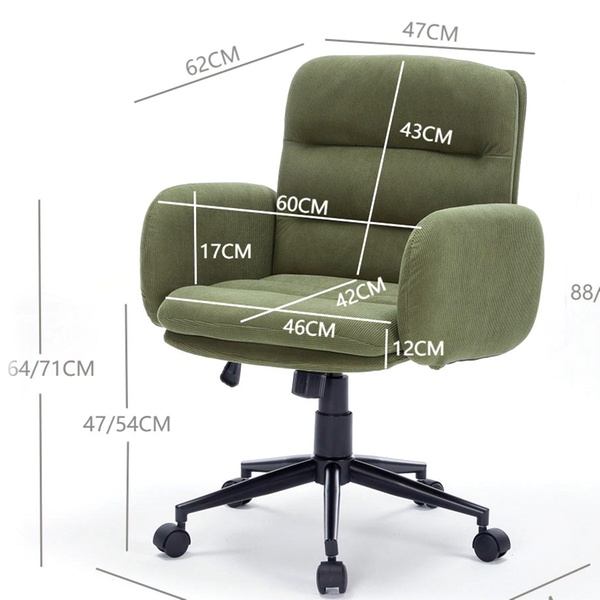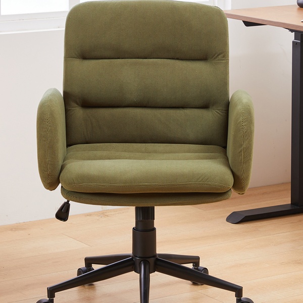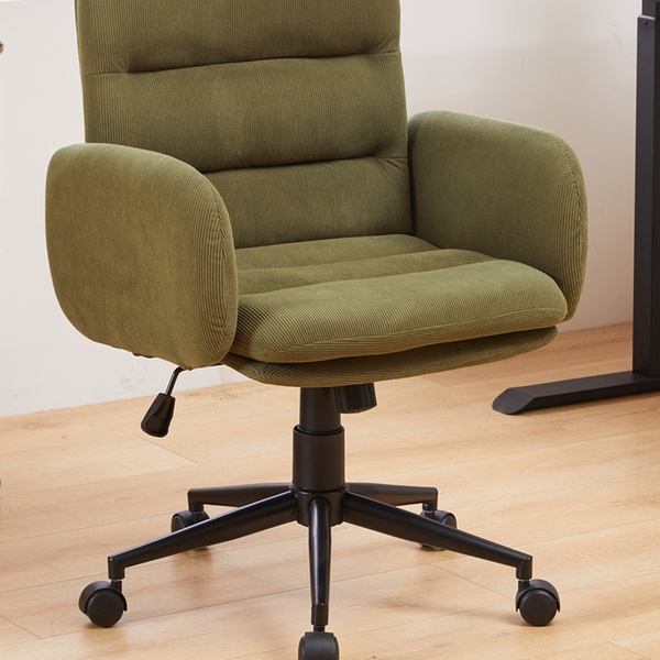 This upholstered swivel office chair boasts an aesthetic feel with a unique green corduroy fabric for stylish comfort.