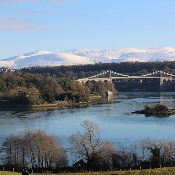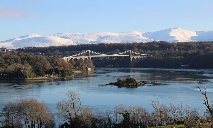 Traveling some 5 minutes a Phot stop of the Menai Bridge, built in 1826 the very first suspension design in the world and one of the most beautiful spanning the Menai Straits, the stretch of turbulent sea that separates Anglesey from the mainland. Also the Britannia Bridge, originally a railway bridge built by Robert Stevenson in 1850. Panoramic view of the Snowdonia Mountain range on a clear day.