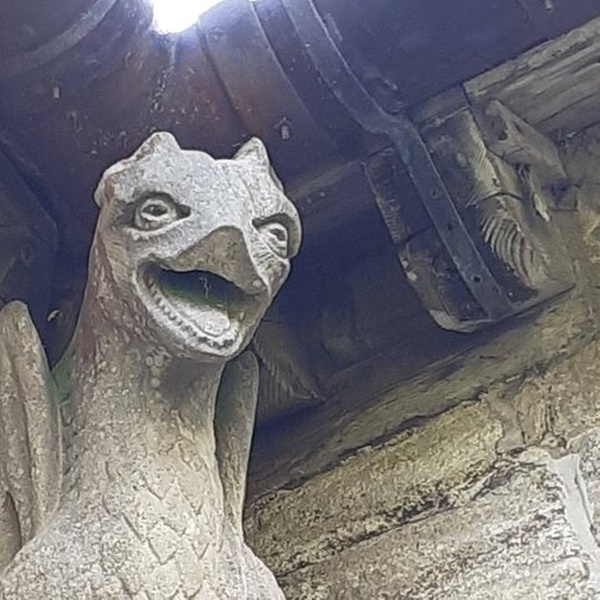 Travel 10 minutes we arrive at the atmospheric Llangadwaladr Church and is wonderful gargoyles. See possibly the first Christian/Celtic Cross carved on the gravestone of a "King of the Britons" See 15th Century Stained glass a relic of the Battle of Bosworth. A Gift from the parents for the return of their son. Reputed Birth place of the Red Dragon Flag of Wales