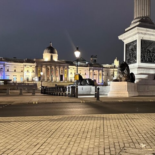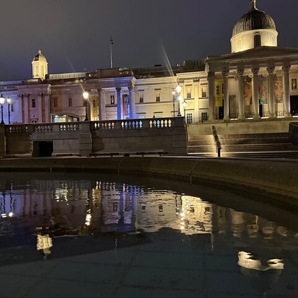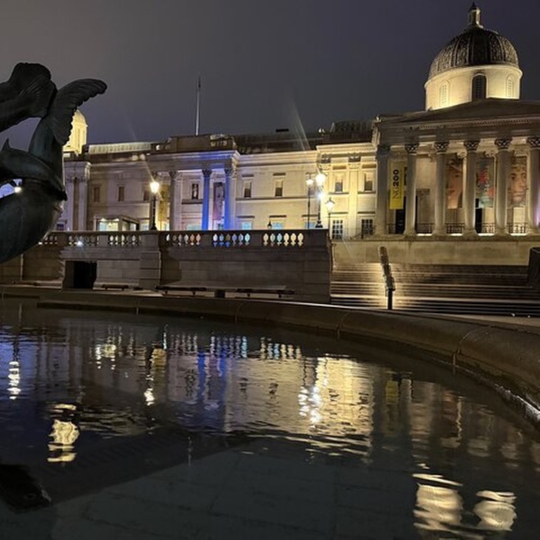 Trafalgar Square comes alive at night, with its fountains and statues beautifully lit, offering a vibrant yet serene atmosphere in the heart of London.