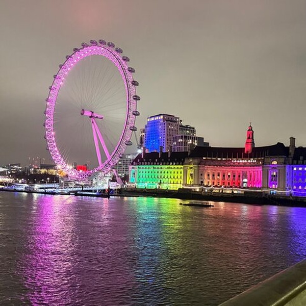 Standing by the Thames, the London Eye dazzles as its lights reflect on the water, creating a magical scene that captures the essence of London at night.