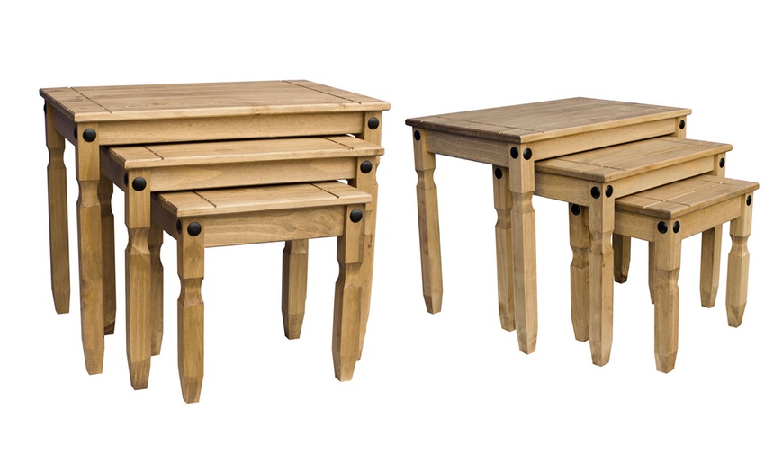 Made in a Mexican style, this three-piece pine nest of tables features carved legs with decorative black metal studs