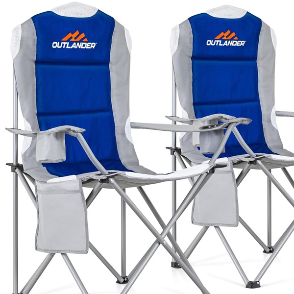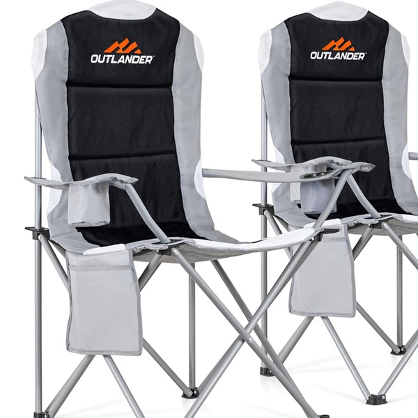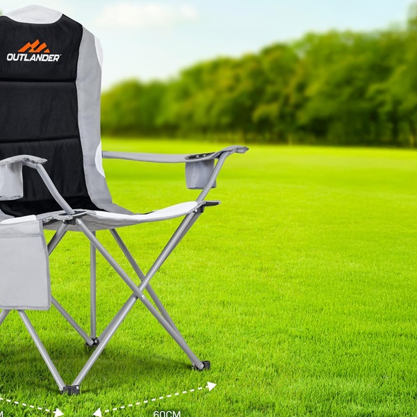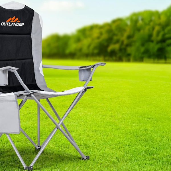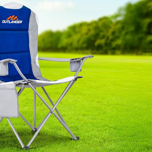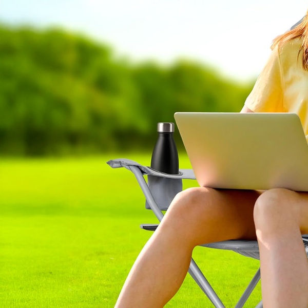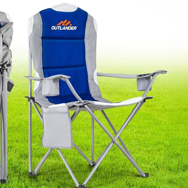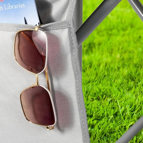 This folding camping chair features cup holders and magazine bags, ensuring comfort and support for most outdoor adventures
