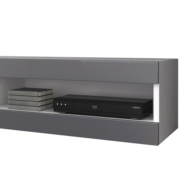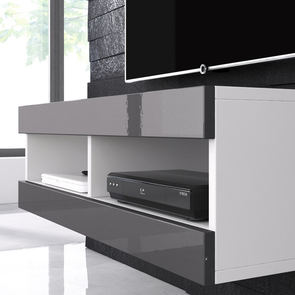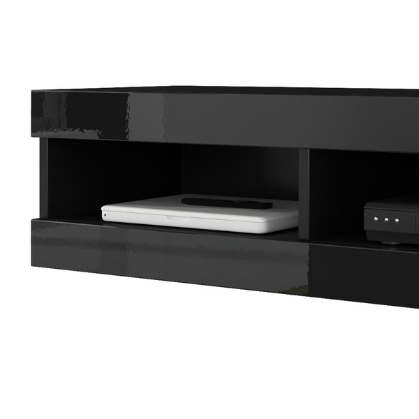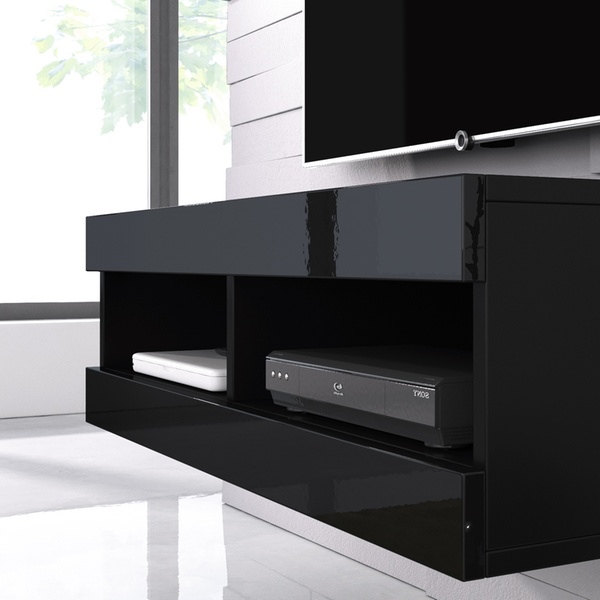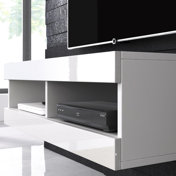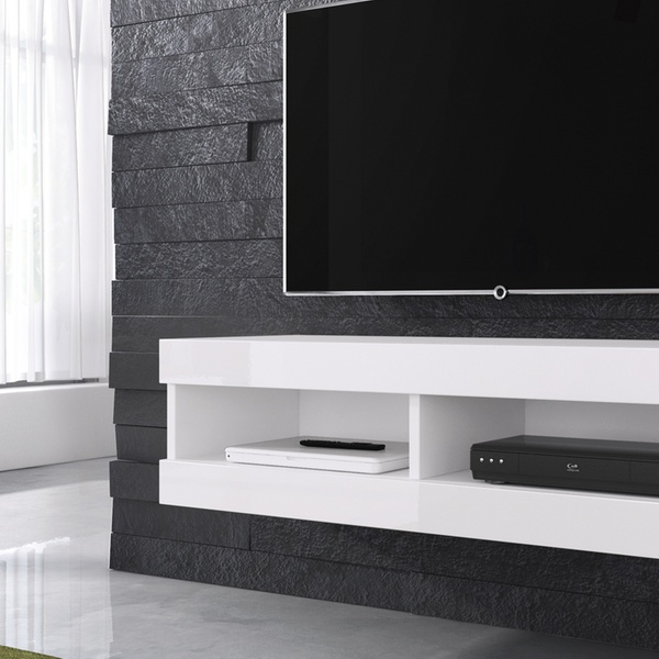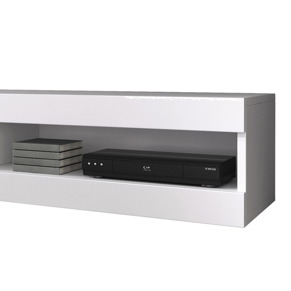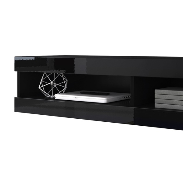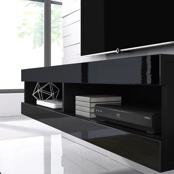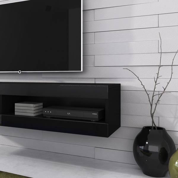 Featuring a modern design, this floating cabinet offers ample storage for magazines, remote controls, video games or consoles
