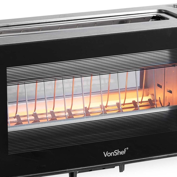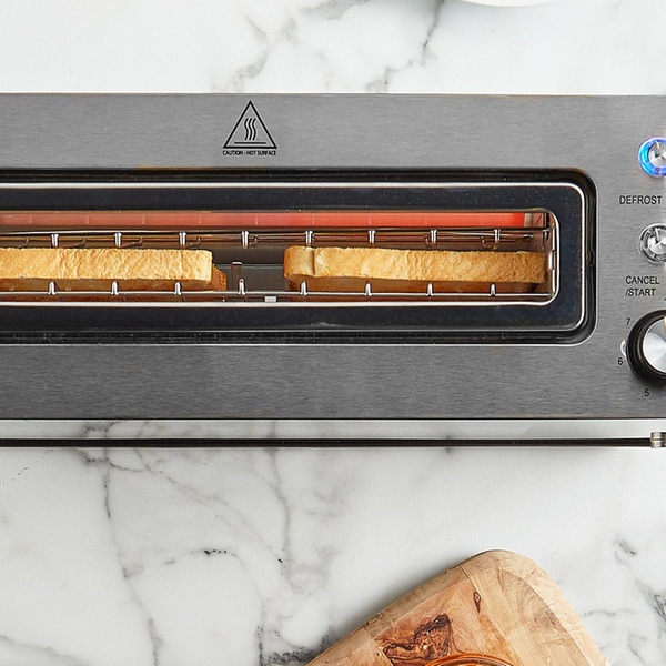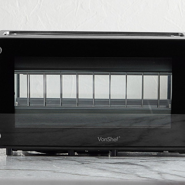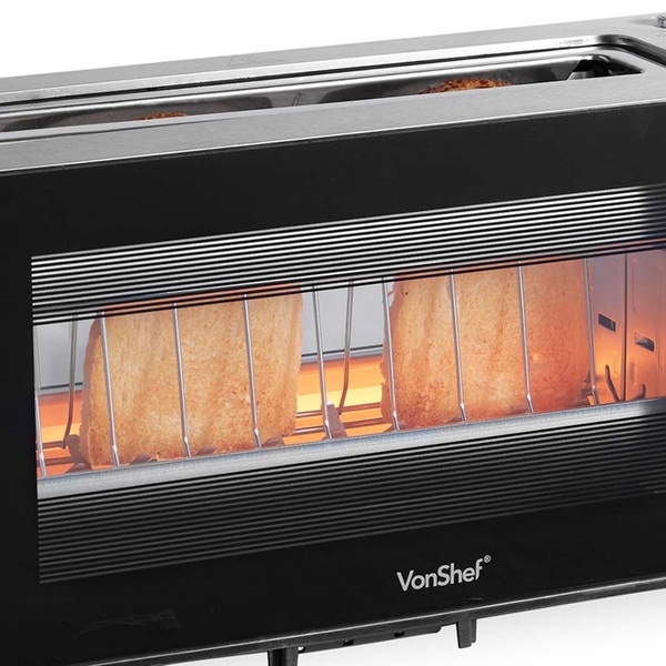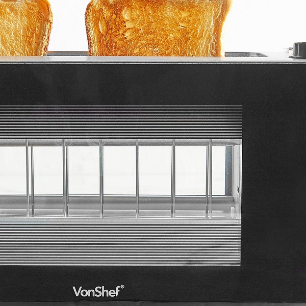 Featuring glass panels on each side to monitor the browning of bread, this two-slice toaster is an ideal addition to the kitchen