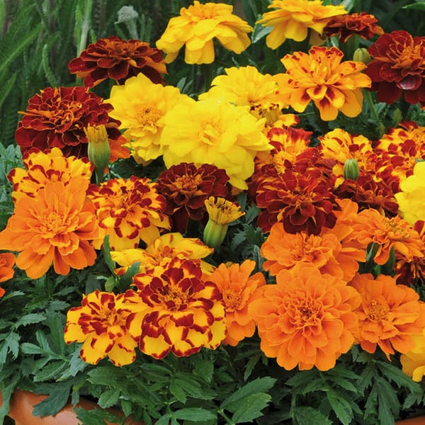 - Marigold 'Durango' Mix - Features bright, large blooms in shades of orange, red, and deep yellow