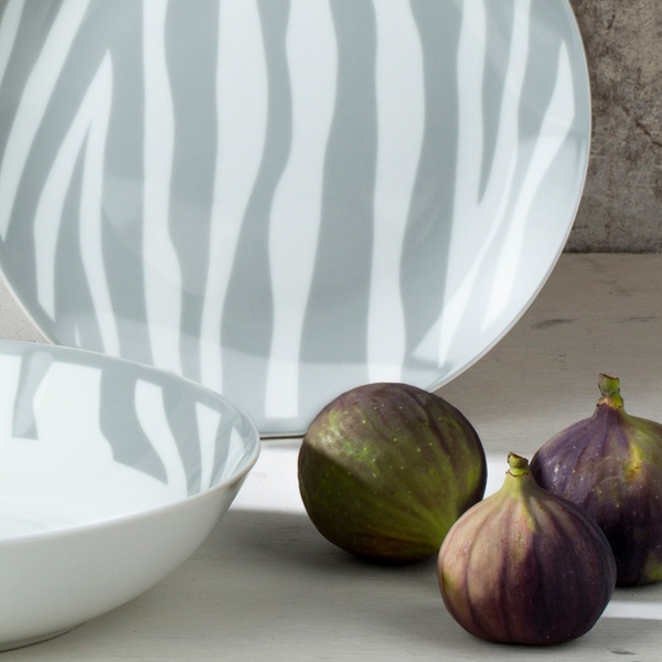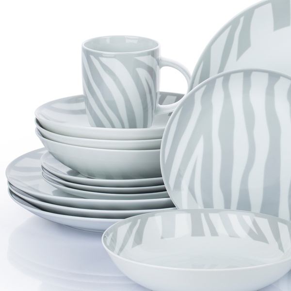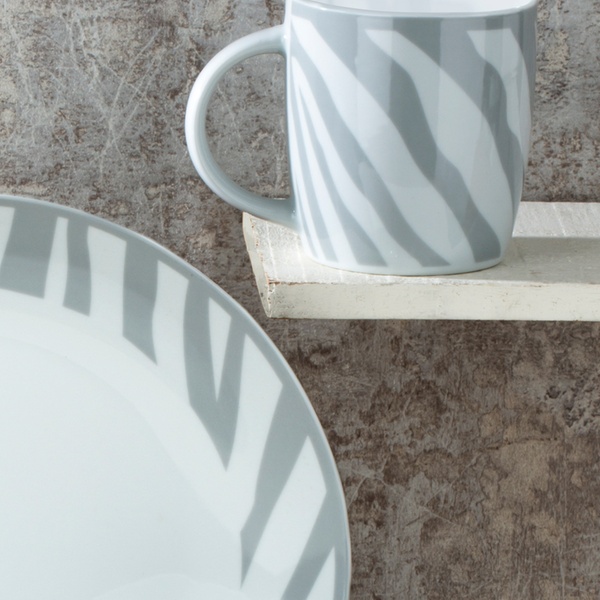 Dishwasher and microwave-safe, this dinner set features a grey zebra/tribal print decal and can be a practical gift for new homeowners