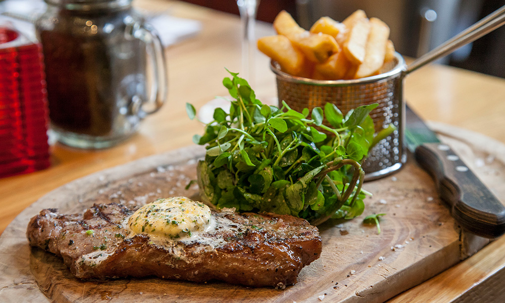8oz British sirloin steak served with chips and a watercress and paprika herb butter (£22.50)