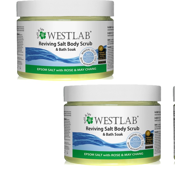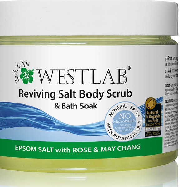 - Fortifying and refreshing Epsom Reviving Salt Body Scrub with rose, lime and may chang