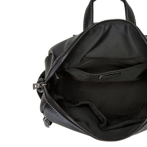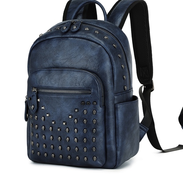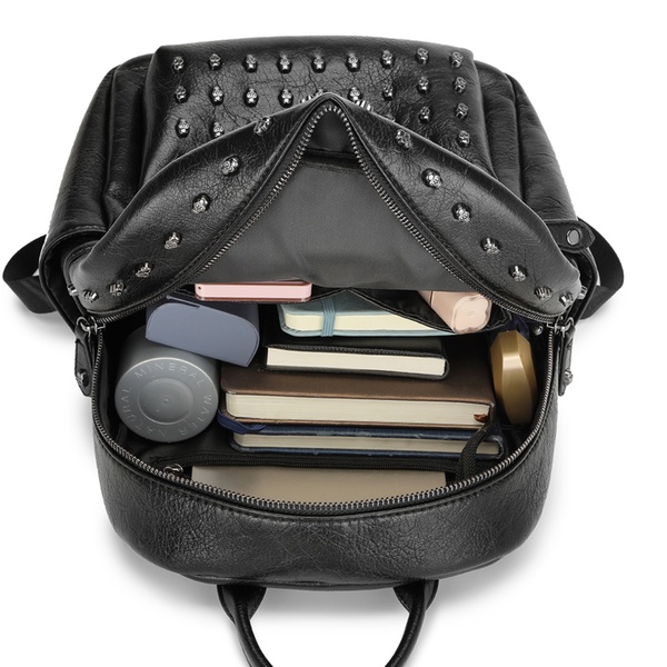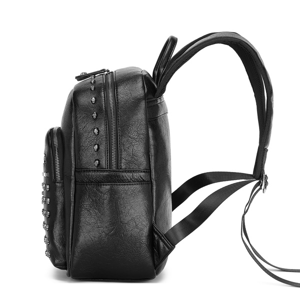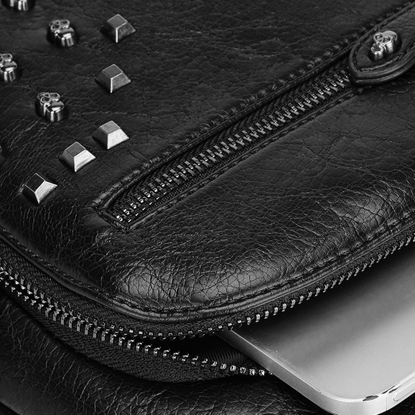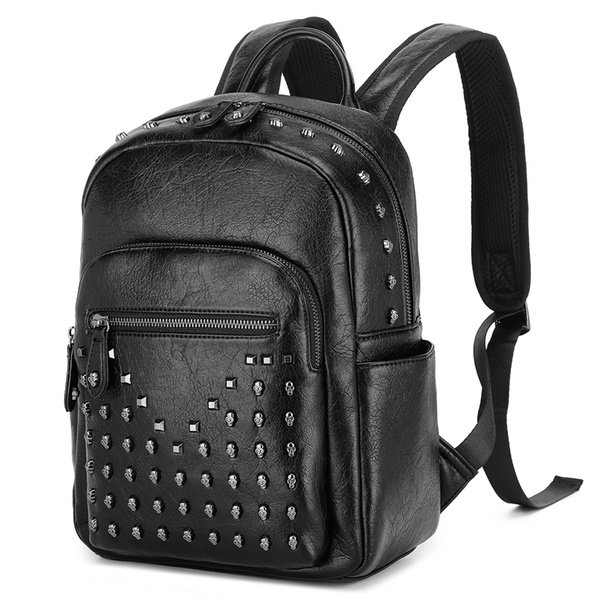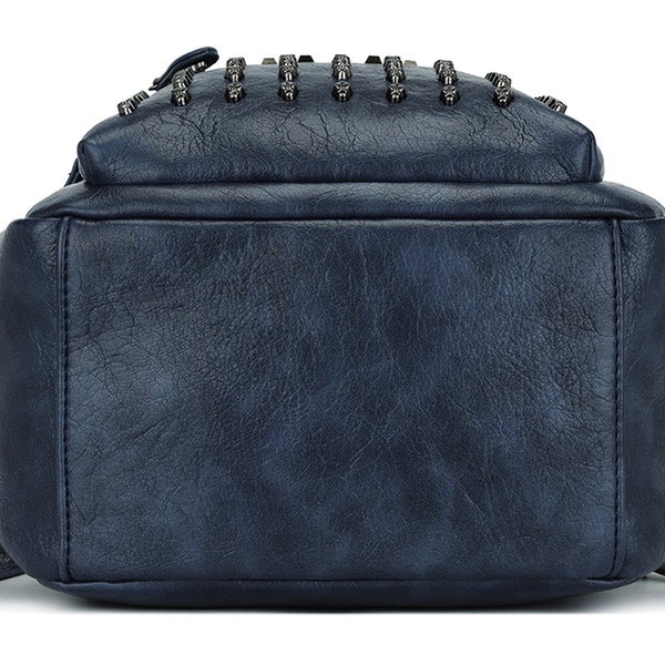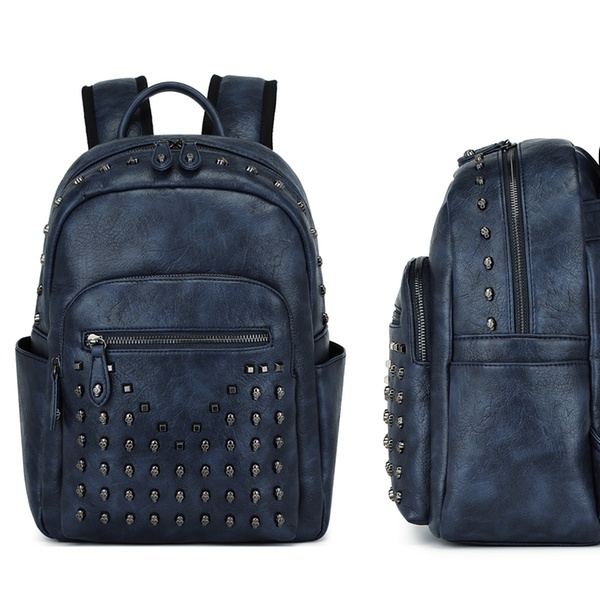 - Front features an eye-catching array of skull studs arranged in an 'M' shape, complemented by a matching row on the main zipper compartment