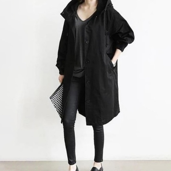 • Straight long tailoring with a hooded design and sharp draped lines to modify the body