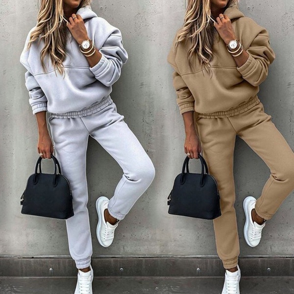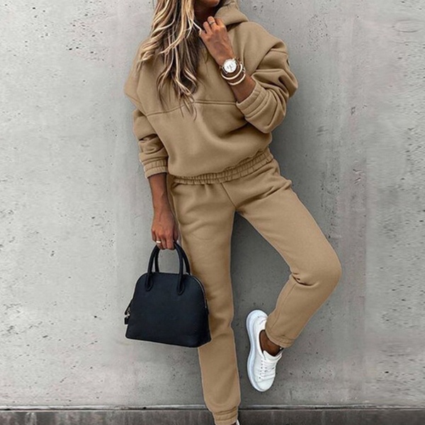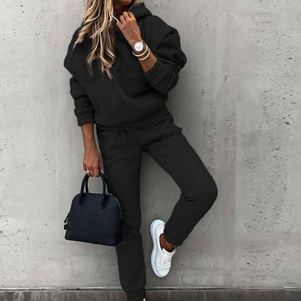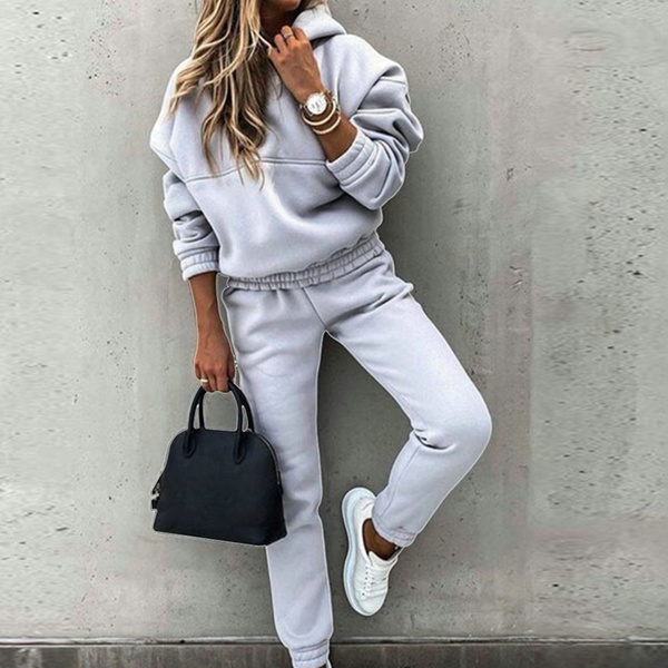 Ideal for everyday casual wear, this two-piece set comprises a long-sleeved, hooded top, and matching pants with elastic waist