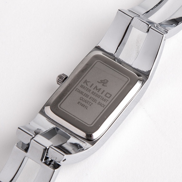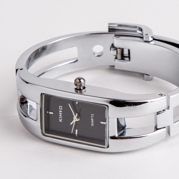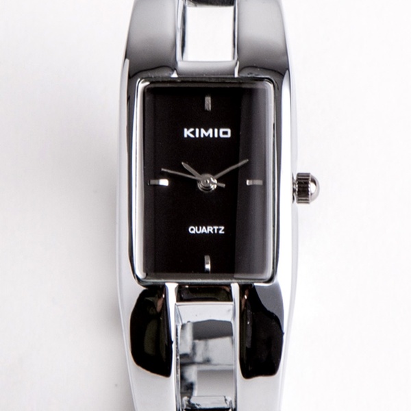 Ideal for most outfits, this women’s wrist watch features a rectangular case with black dial and polished stainless steel bracelet