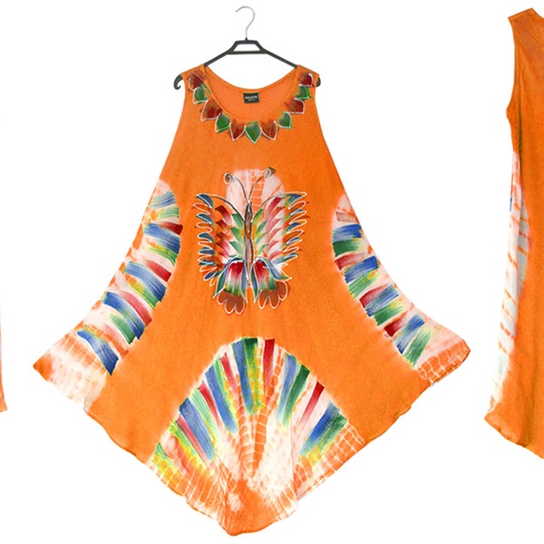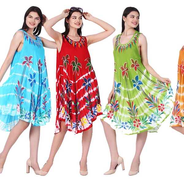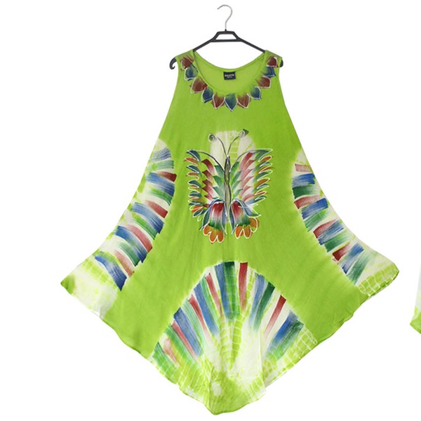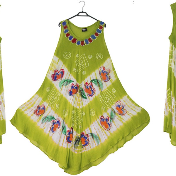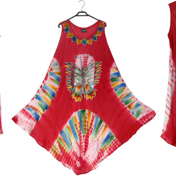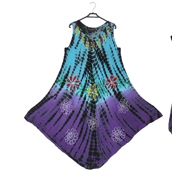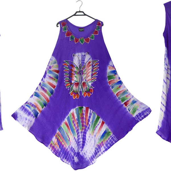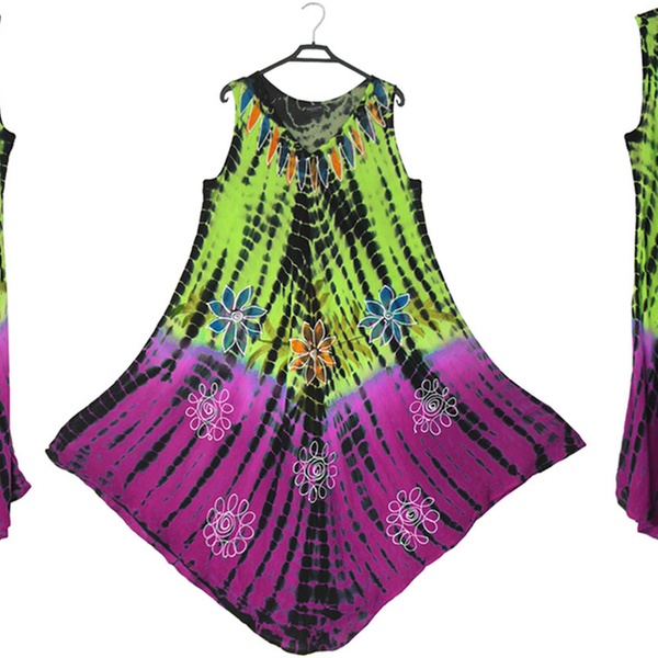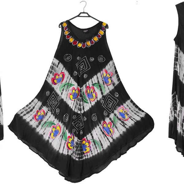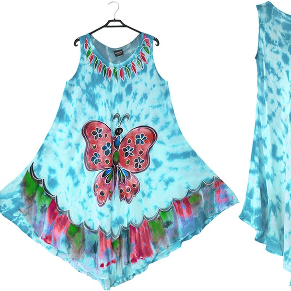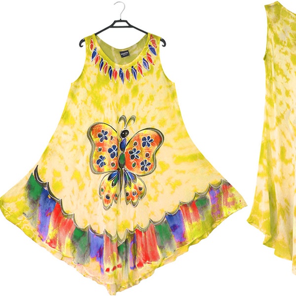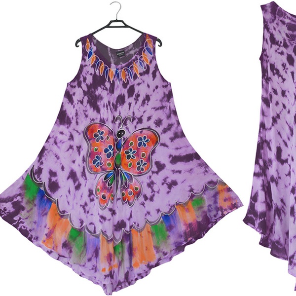 - Features a front round neck with wide straps, umbrella flared bottom and all-over tie-dye floral or butterfly print