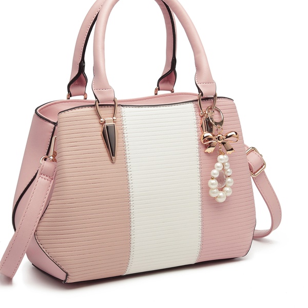 - Decorated with a detachable keychain pendant featuring a gold-toned bow