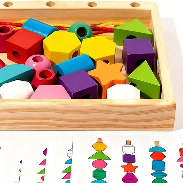 - Complete educational set with 25 colourful wooden beads in various shapes, a sturdy wooden box, 5 pegs, 8 pattern cards, and 2 laces