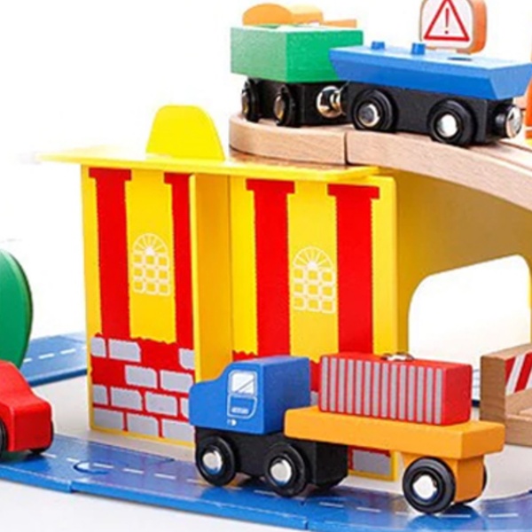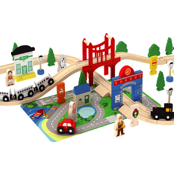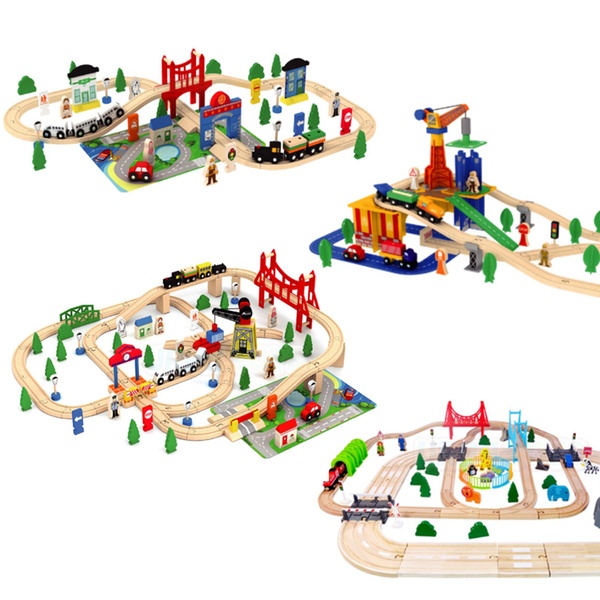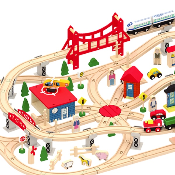 These wooden sets include a variety of wooden track pieces like a vocal train station, bridges, cars, buildings, people and magnetic trains