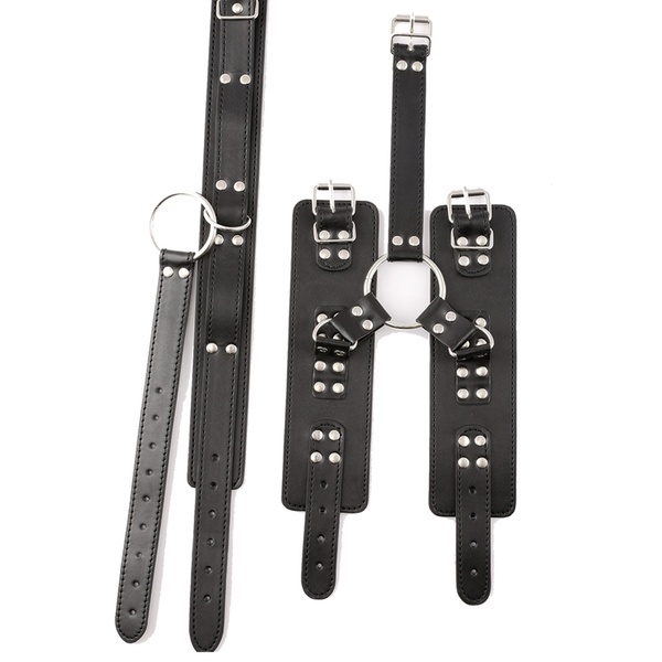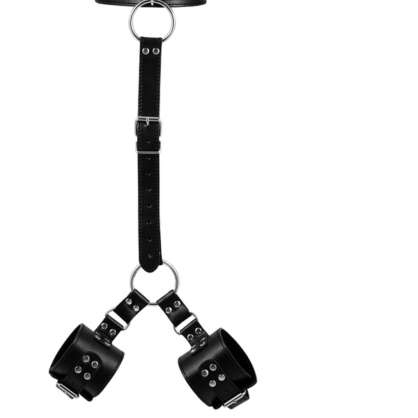 This harness comes with an adjustable strap that may help restraint the wrists to the collar