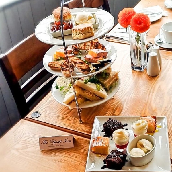 Cornish Scones with Strawberry Jam & Cornish Clotted Cream, Homemade Lemon sponge Cake & Lemon Drizzle, Cornish Raspberry Coulee Cheesecake, Homemade Chocolate Cake & Chocolate Drizzle - Hot Drinks: Selection of Specialty Teas such as Red Berries, Peppermint, Camomile, Breakfast & Freshly Brewed Coffee.