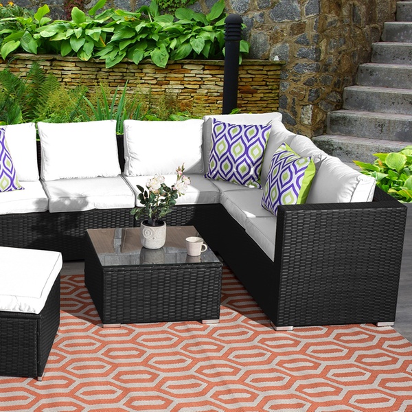 Have a nice garden party or a lazy afternoon outside with this comfy and durable set including two sofas, footstool, and a table