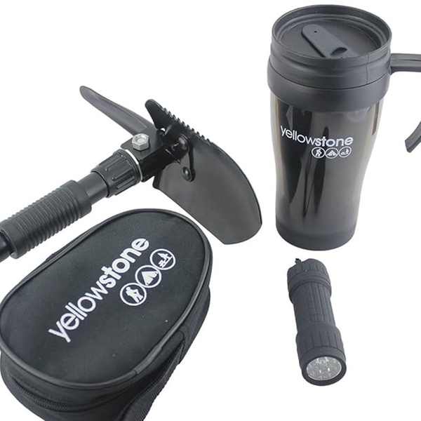 A compact and durable car travel and emergency kit, featuring an insulated 450ml travel mug, a sturdy mini folding shovel, and a bright 9-LED pocket torch with batteries included, making it an ideal gift for travellers, road trip enthusiasts and new drivers
