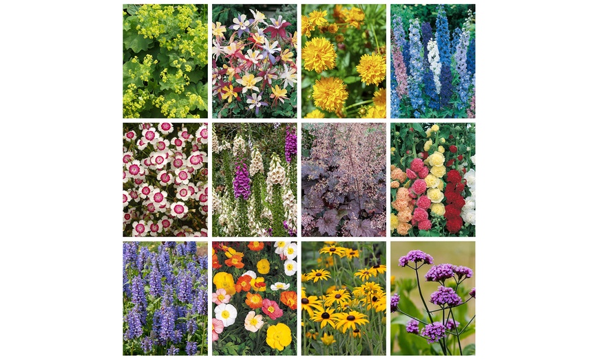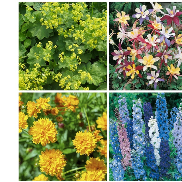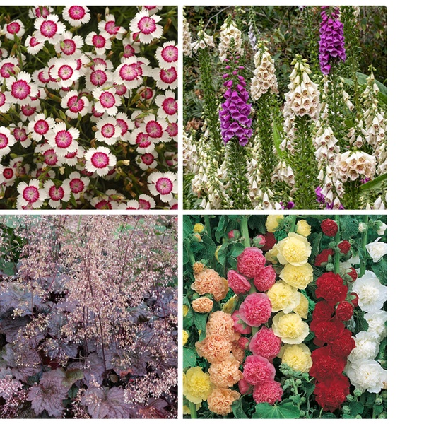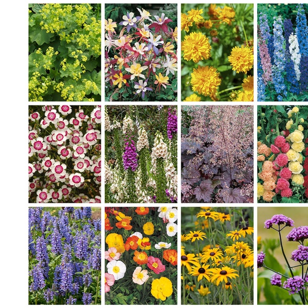 - Main varieties included (but not guaranteed) Nepeta 'Blue Moon', Dianthus 'Arctic Fire', Heuchera 'Palace Purple', Papaver 'Champagne Bubbles', Verbena 'Buenos Airies', Alchemilla mollis, Aquilegia 'Mrs Scott Elliot', Coreopsis 'Early Sunrise', Delphinium 'Fountain' Mix, Digitalis 'Dalmatian' Mix, Hollyhock 'Chaters Double' Mix, and Rudbeckia 'Goldsturm'.