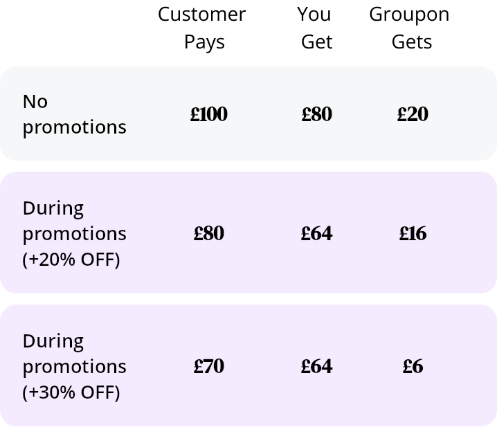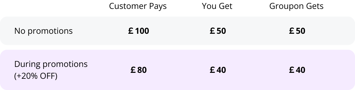 Groupon co-invests with you. We cut our profits and cover a portion of the cost of your promotion.