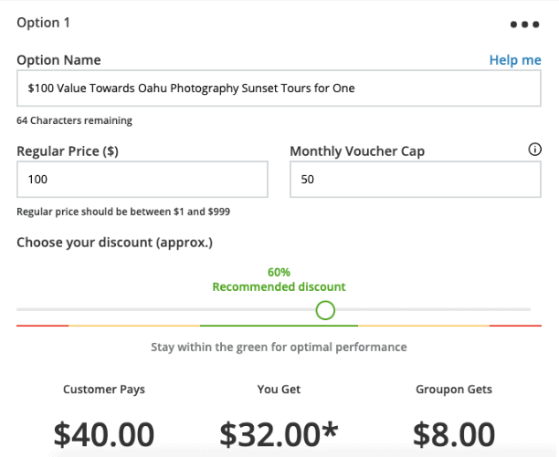 Once you’ve chosen a campaign structure, you’ll need to set the price and number of vouchers you want to offer. When choosing your discount you will transparently receive information on how much the customer pays, how much you get and what Groupon gets. There is also a bar indicating the expected performance of your campaign. Stay within the green for optimal performance. In this step, you can also set up multiple campaign options at once to cover a broader audience.